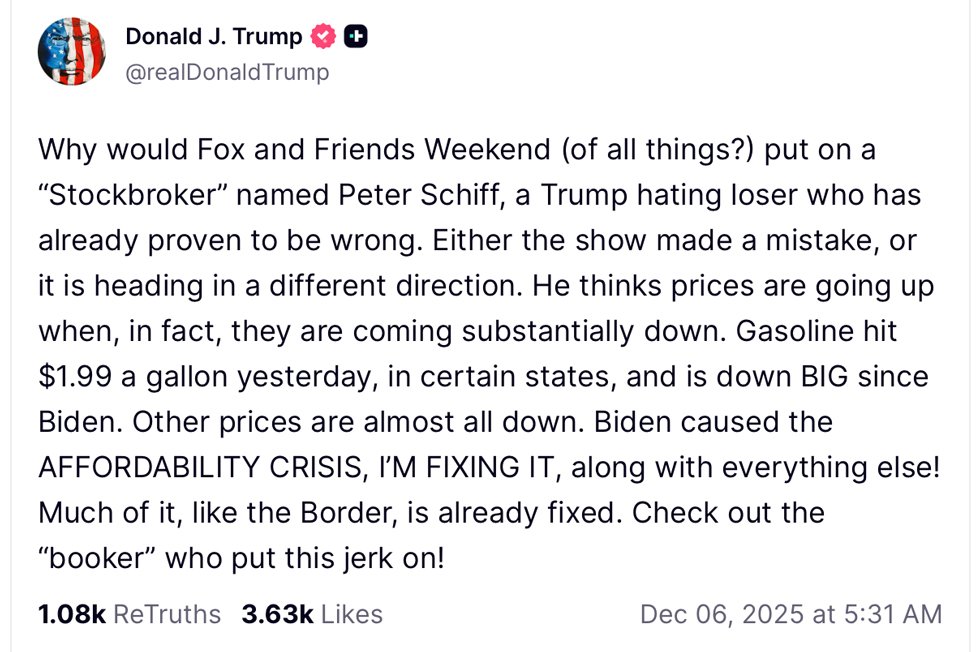 Donald Trump woke up Saturday morning raging at his longtime safe space, Fox & Friends Weekend. The president blew a gasket after the show booked Peter Schiff, the financial commentator who’s been warning about the country’s affordability crisis and didn’t hesitate to challenge Trump’s brag-filled version of the economy.