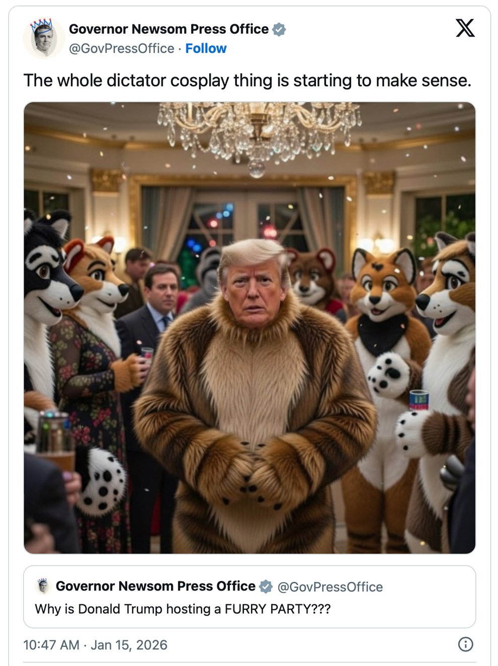 “The whole dictator cosplay thing is starting to make sense,” Newsom posted on X alongside an AI rendering showing Trump in a lion costume, holding the head, surrounded by a pack of humans dressed as dogs.