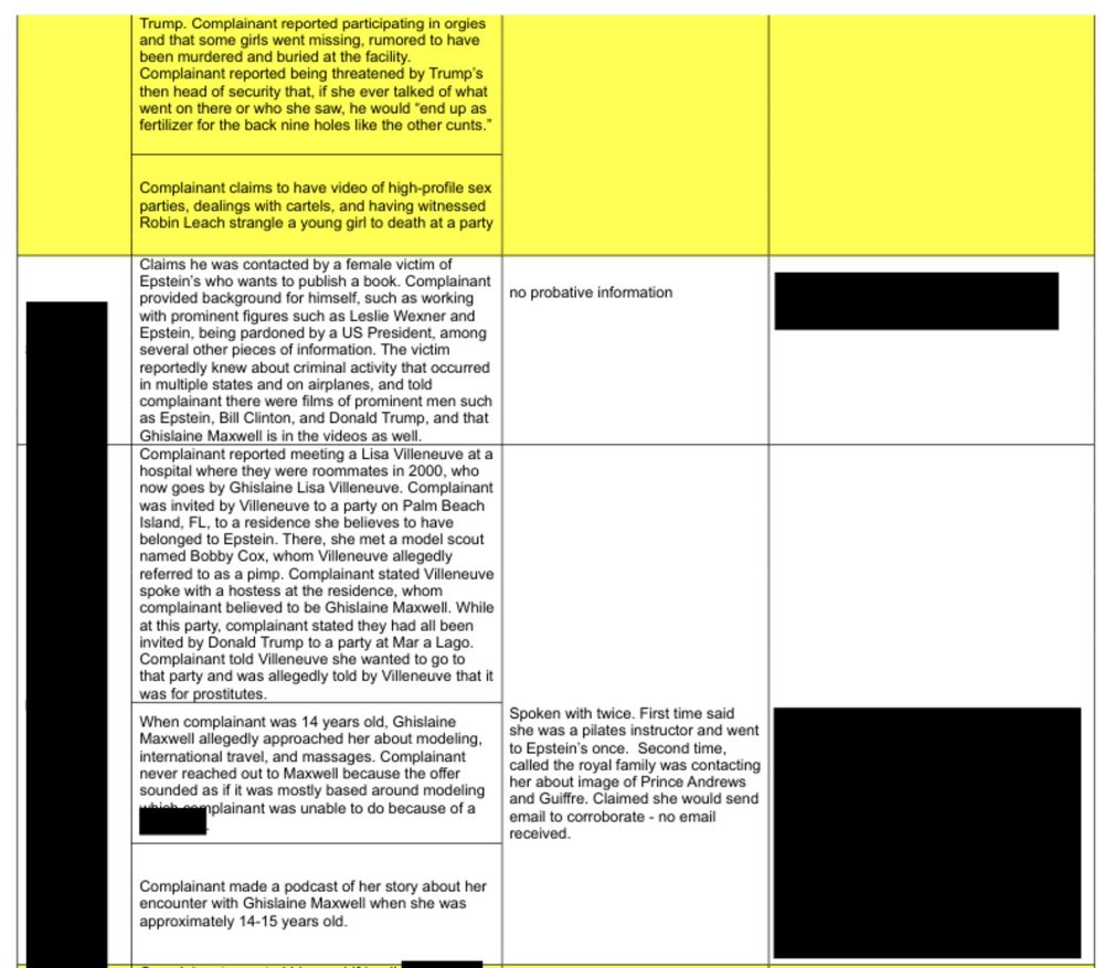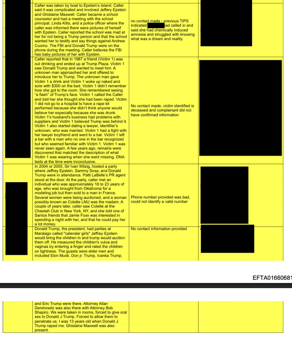 “Complainant noted Trump repeatedly stated the name ‘Jeffrey’ while on the phone. One of complainant’s ex-girlfriend’s [edacted] told complainant Trump raped her, as did Epstein.”