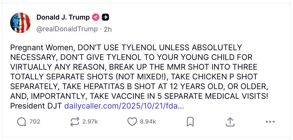 Trump wrote: “Pregnant Women, DON’T USE TYLENOL UNLESS ABSOLUTELY NECESSARY, DON’T GIVE TYLENOL TO YOUR YOUNG CHILD FOR VIRTUALLY ANY REASON, BREAK UP THE MMR SHOT INTO THREE TOTALLY SEPARATE SHOTS (NOT MIXED!), TAKE CHICKEN P SHOT SEPARATELY, TAKE HEPATITAS B SHOT AT 12 YEARS OLD, OR OLDER, AND, IMPORTANTLY, TAKE VACCINE IN 5 SEPARATE MEDICAL VISITS! President DJT”