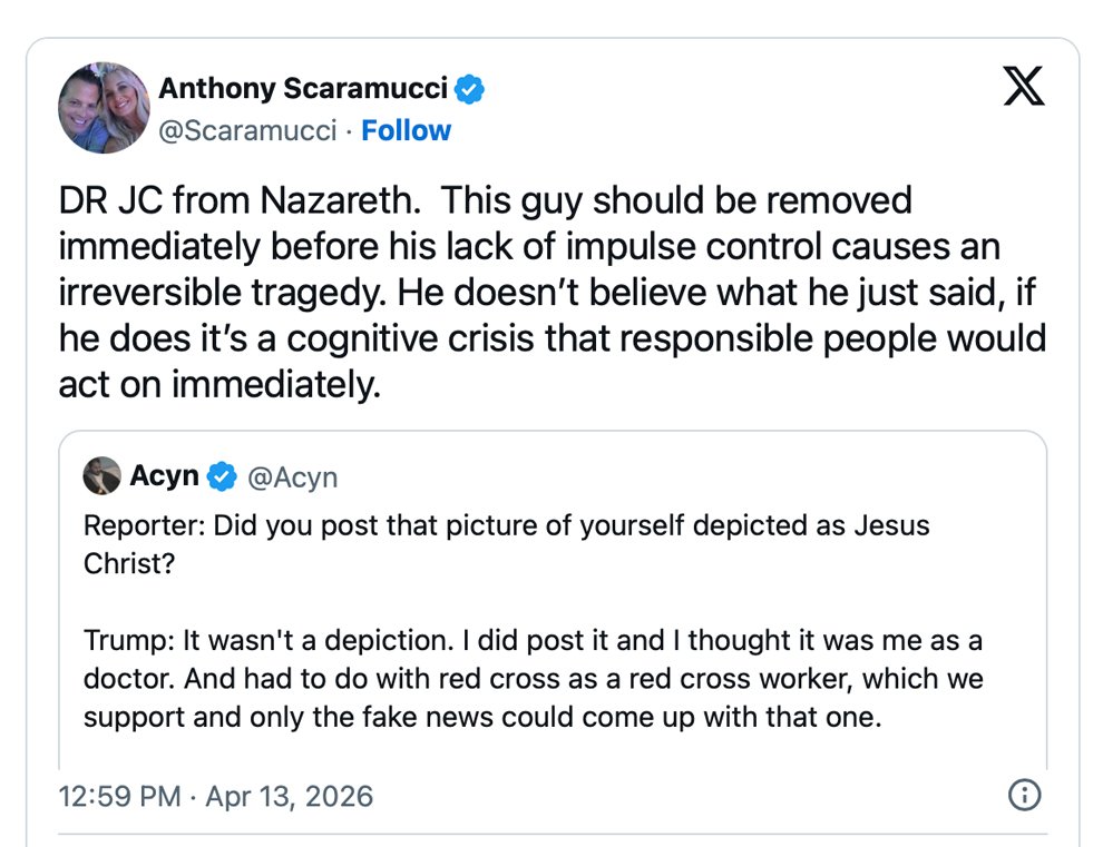 “This guy should be removed immediately before his lack of impulse control causes an irreversible tragedy,” Scaramucci wrote. “He doesn’t believe what he just said. If he does, it’s a cognitive crisis that responsible people would act on immediately.”