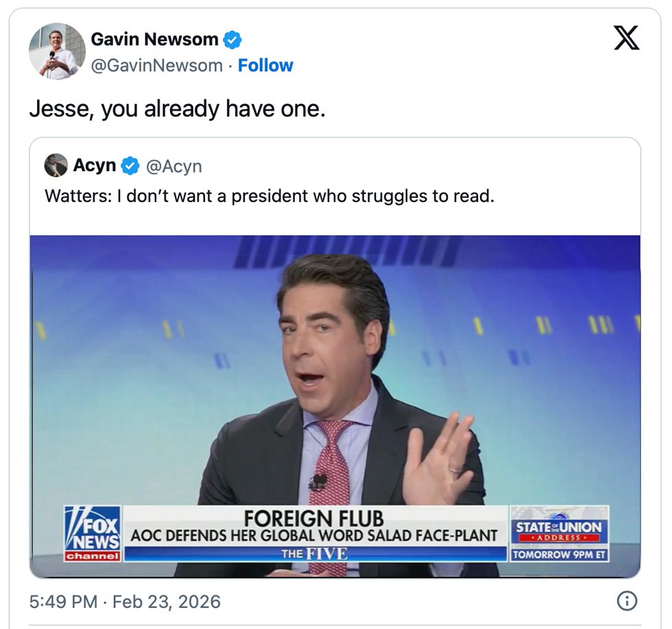 Newsom shared a clip on X of Fox News host Jesse Watters discussing the governor’s recent book tour stop in Atlanta. In the video, Newsom spoke to Atlanta Mayor Andre Dickens about his dyslexia, saying, “I’m not trying to impress you. I’m just trying to impress upon you: I’m like you. I’m no better than you. You know, I’m a 960 SAT guy.”