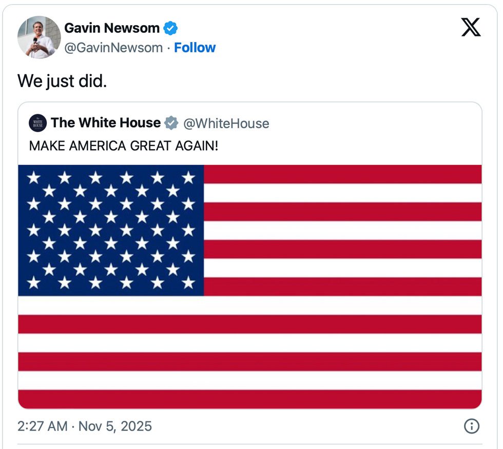After the results rolled in, Newsom quote-posted it with just three words that summed up the night: “We just did.”