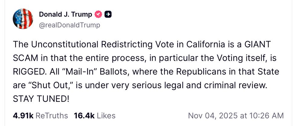 Trump did not specify which authorities might be investigating California’s rules, which allow any registered voter to vote by mail. But he framed Proposition 50, the Democrats’ mid-decade redistricting measure, as yet another attempt to curb Republican power.