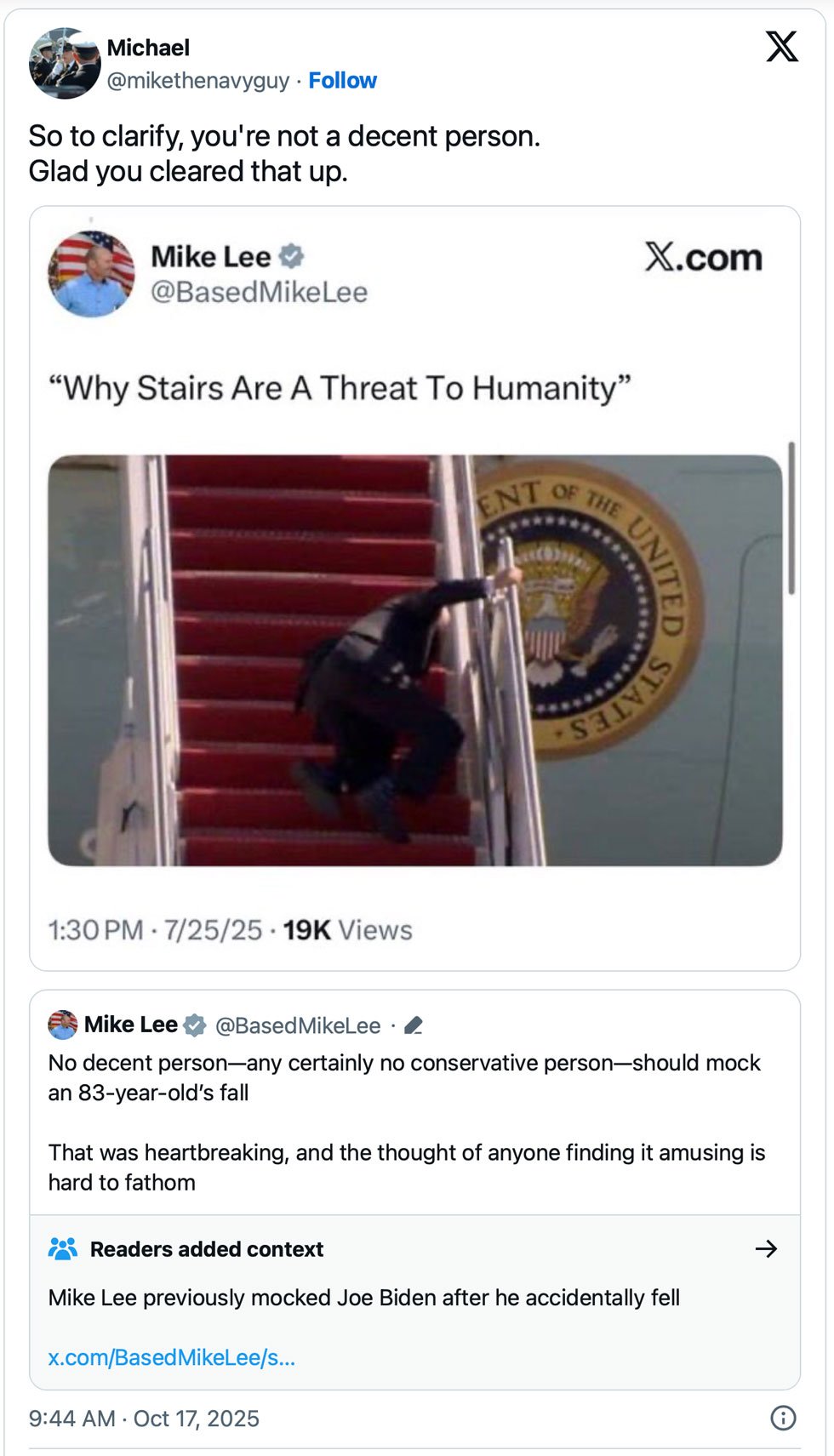 Critics didn’t have to dig deep to find the hypocrisy. Back in July, Lee himself mocked President Joe Biden after the 80-year-old tripped while boarding Air Force One—a moment that spawned its own wave of viral jokes and reaction clips. Lee joined in, gleefully posting, “He’s totally fine,” with a sarcastic emoji-laden tweet over a clip of Biden’s stumble.
