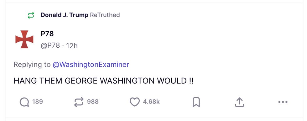 Trump then amplified supporters’ violent rhetoric, reposting messages that included explicit calls for hanging the lawmakers. “HANG THEM GEORGE WASHINGTON WOULD !!” one post reads.