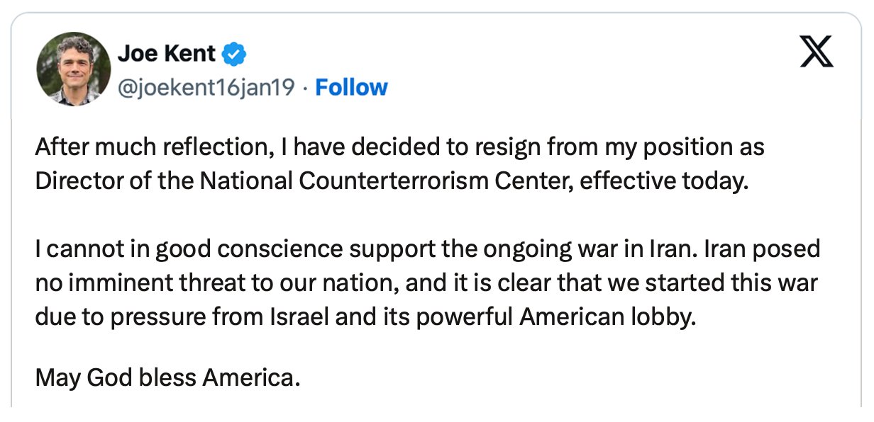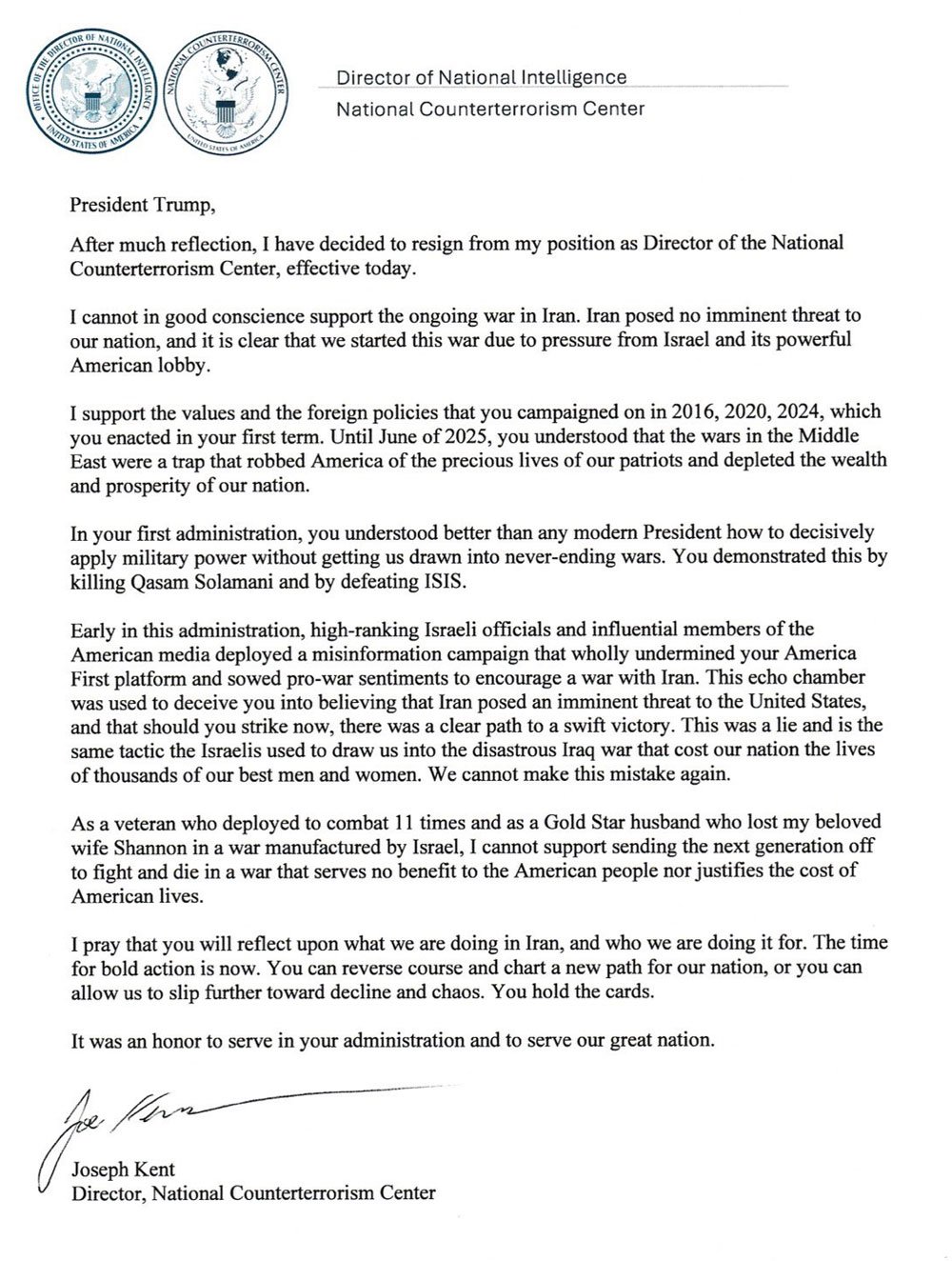 In a stunning break from inside the administration, National Counterterrorism Center Director Joe Kent has resigned in protest of President Donald Trump’s escalating war with Iran, now entering its third week.