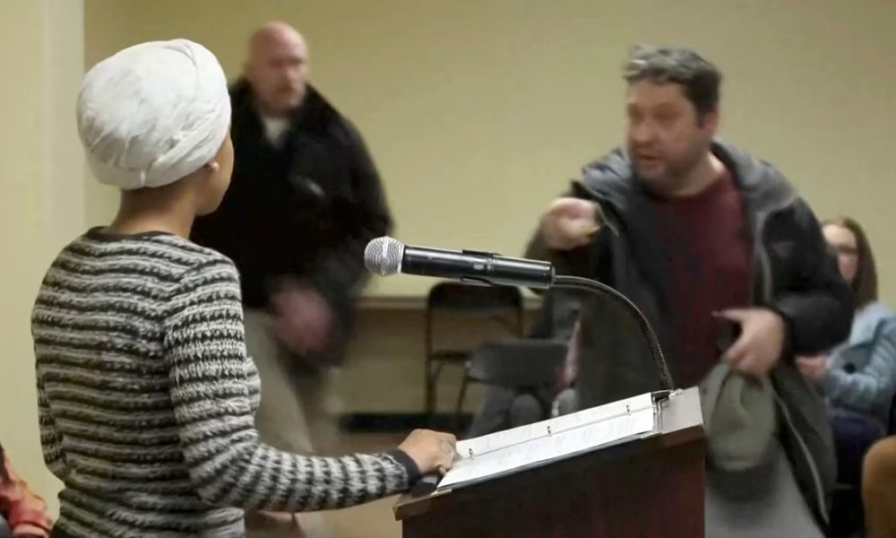Rep. Ilhan Omar (D-MN) delivered a sharp rebuke of Donald Trump Tuesday night after a man rushed the stage at her Minneapolis town hall and sprayed an unknown substance at her — an incident she brushed off before turning her fire directly on the president.
