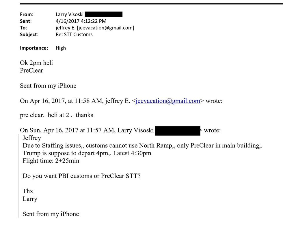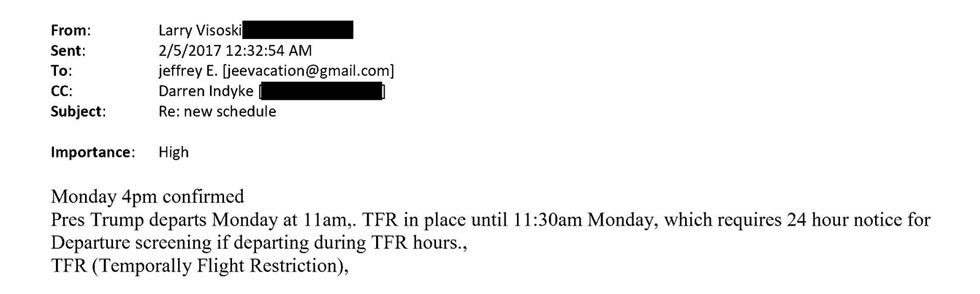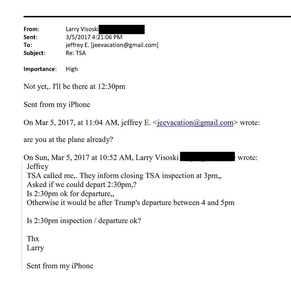 “Jeffrey, TSA called me, they inform closing TSA inspection at 3pm, asked if we could depart at 2:30pm? Is 2:30pm okay for departure,” he wrote. “Otherwise it would be after Trump’s departure between 4 and 5pm.”