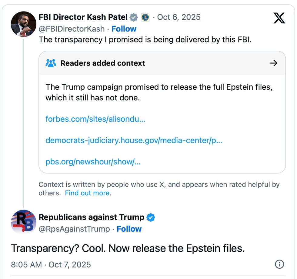 “Transparency? Cool. Now release the Epstein files,” replied the Republicans Against Trump account, summing up the sentiment echoed by a tidal wave of furious replies.
