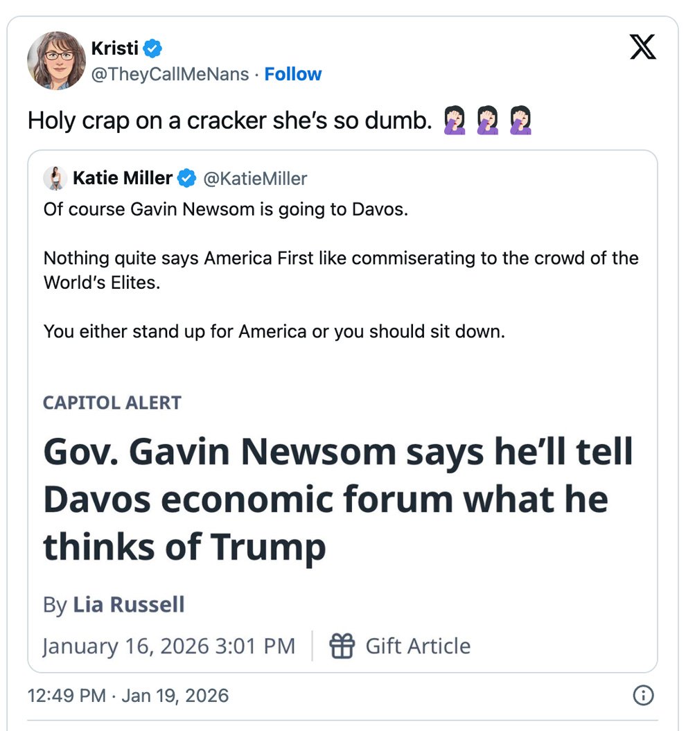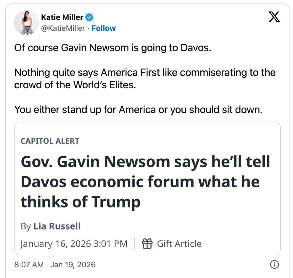 Conservative podcaster Katie Miller, well‑known as Stephen Miller’s wife and a loyal Trump ally, set out to dunk on California Gov. Gavin Newsom’s attendance at the World Economic Forum in Davos — and instead got dunked on herself.