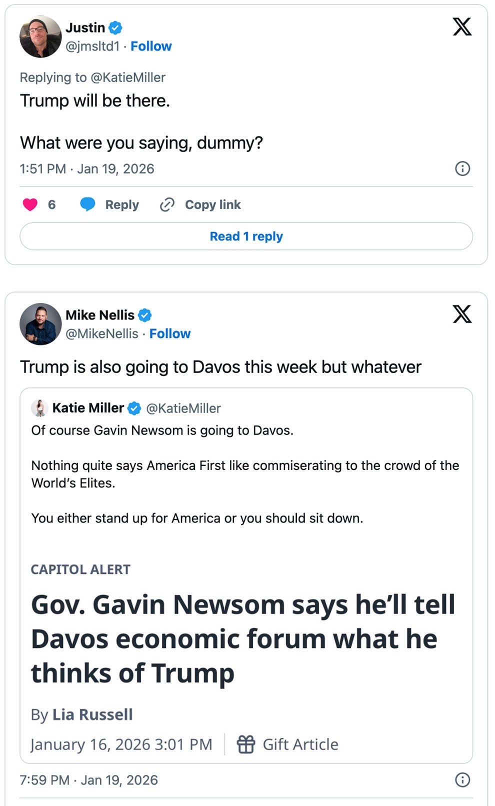On Monday, Miller took to X with a snarky screed accusing Newsom of hypocrisy for attending the global gathering of world leaders in Switzerland. “Of course Gavin Newsom is going to Davos,” she wrote, adding, “Nothing quite says America First like commiserating to the crowd of the World’s Elites. You either stand up for America or you should sit down.”