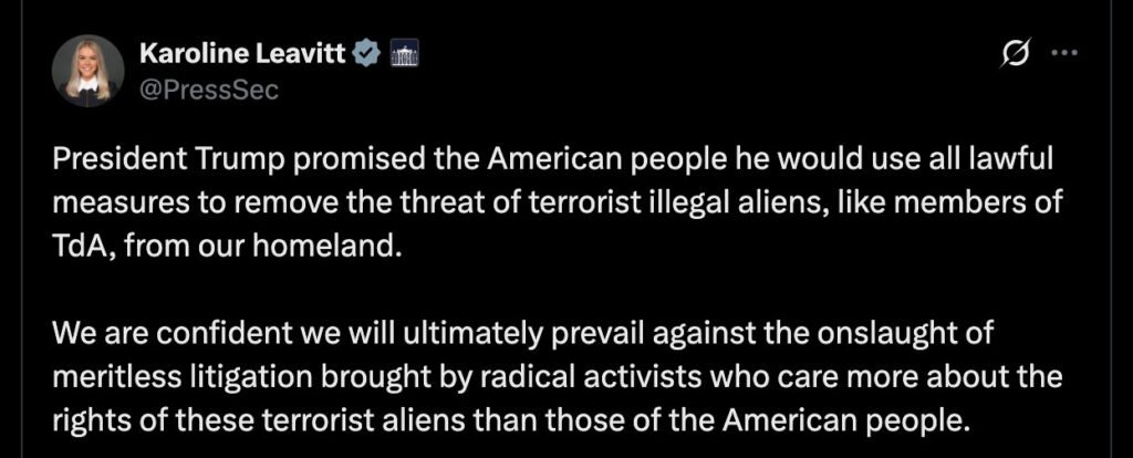White House press secretary Karoline Leavitt echoed the outrage: “We are confident we will ultimately prevail against the onslaught of meritless litigation brought by radical activists who care more about the rights of these terrorist aliens than those of the American people.”