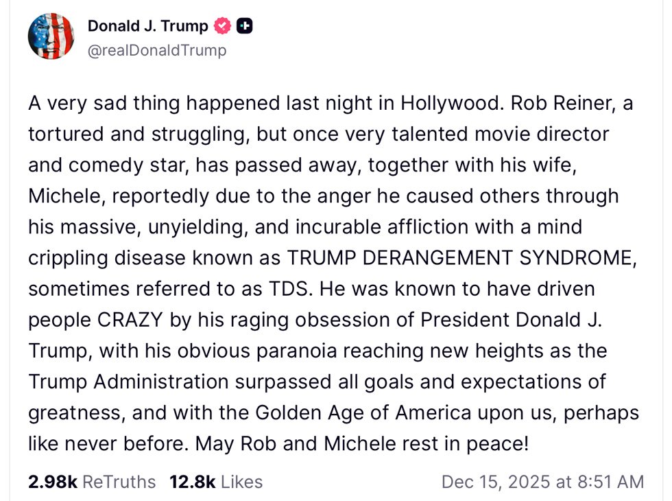 “A very sad thing happened last night in Hollywood,” Trump wrote. “Rob Reiner, a tortured and struggling, but once very talented movie director and comedy star, has passed away, together with his wife, Michele, reportedly due to the anger he caused others through his massive, unyielding, and incurable affliction with a mind crippling disease known as TRUMP DERANGEMENT SYNDROME, sometimes referred to as TDS.