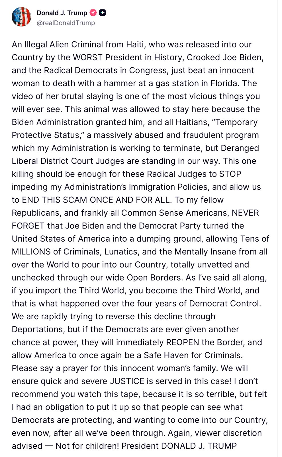 In the post, Trump alleged that the attacker was a Haitian man with Temporary Protected Status and blamed Joe Biden and Democrats for allowing the suspect into the country. He described the video as “one of the most vicious things you will ever see,” using the incident to argue for sweeping immigration crackdowns.