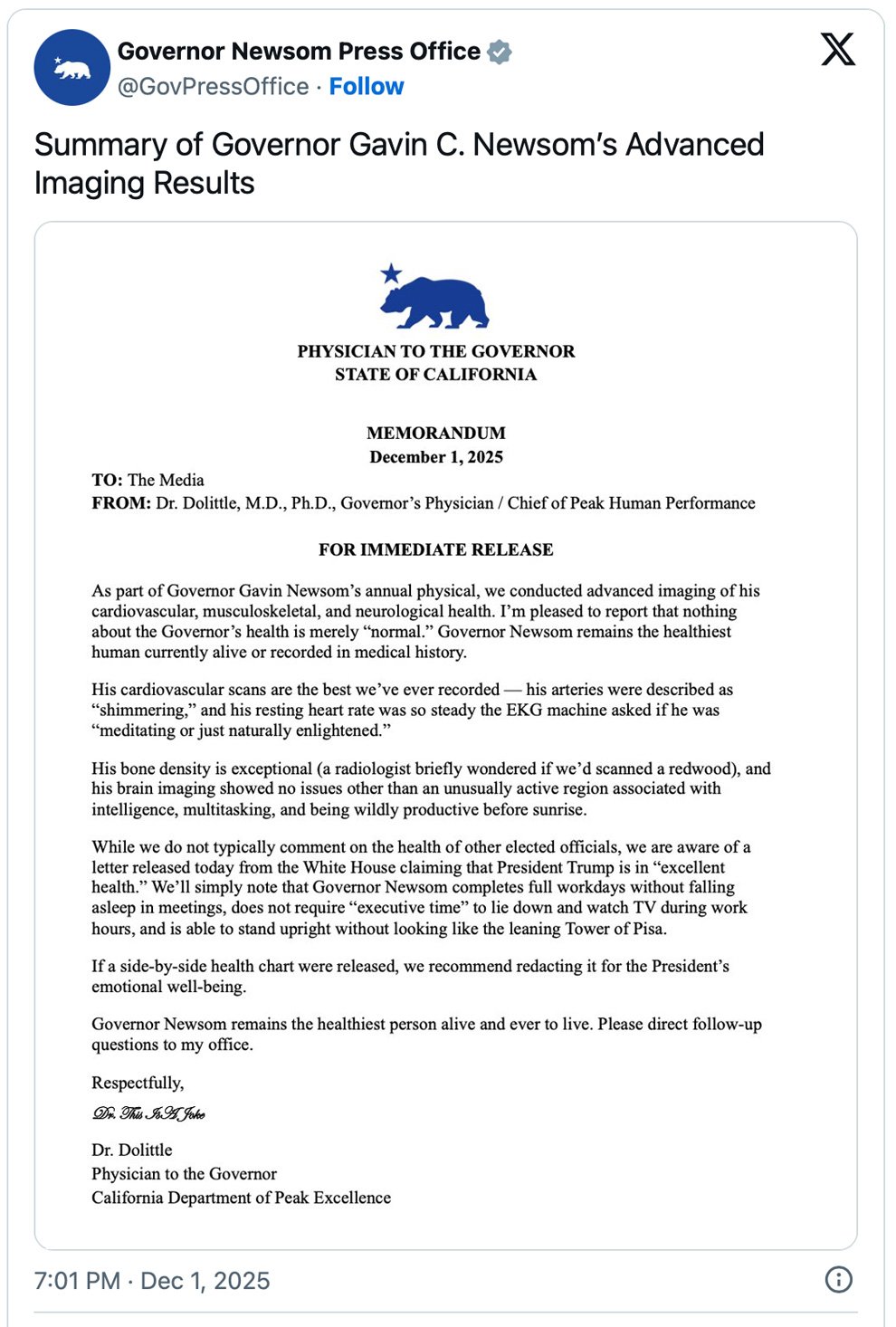 Just hours after the White House published a letter from Trump’s physician declaring the 79-year-old to be in excellent health following a “preventative” MRI, Newsom’s team fired back with a parody so on-the-nose it barely needed explanation. Written by the mysteriously credentialed “Dr. Doolittle,” the faux report portrayed Newsom, 58, as nothing short of superhuman — “the healthiest person alive and ever to live.”