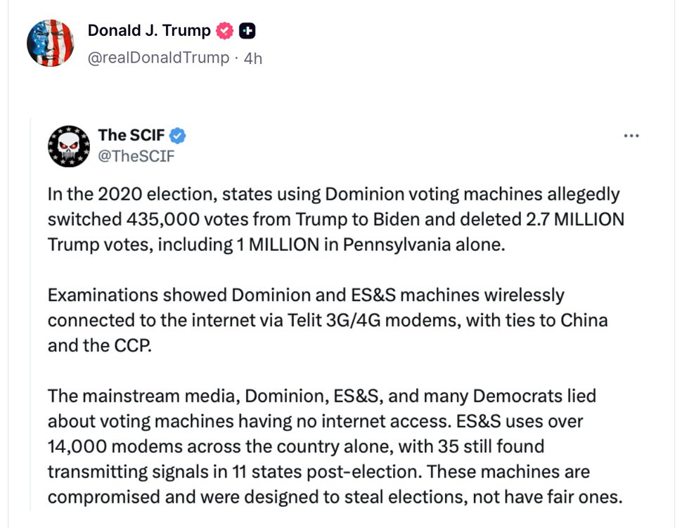 “In the 2020 election, states using Dominion voting machines allegedly switched 435,000 votes from Trump to Biden and deleted 2.7 MILLION Trump votes, including 1 MILLION in Pennsylvania,” one post read, despite those claims having been repeatedly debunked. Another included a video of Sen. Chuck Schumer from 1996 and a caption urging, “PASS THE SAVE ACT!!!”
