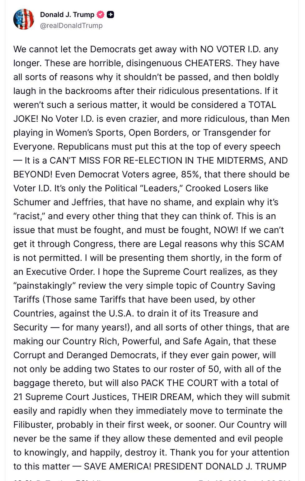 In another post he wrote: “We cannot let the Democrats get away with NO VOTER I.D. any longer. These are horrible, disingenuous CHEATERS. They have all sorts of reasons why it shouldn’t be passed, and then boldly laugh in the backrooms after their ridiculous presentations. If it weren’t such a serious matter, it would be considered a TOTAL JOKE! No Voter I.D. is even crazier, and more ridiculous, than Men playing in Women’s Sports, Open Borders, or Transgender for Everyone. Republicans must put this at the top of every speech — It is a CAN’T MISS FOR RE-ELECTION IN THE MIDTERMS, AND BEYOND!”