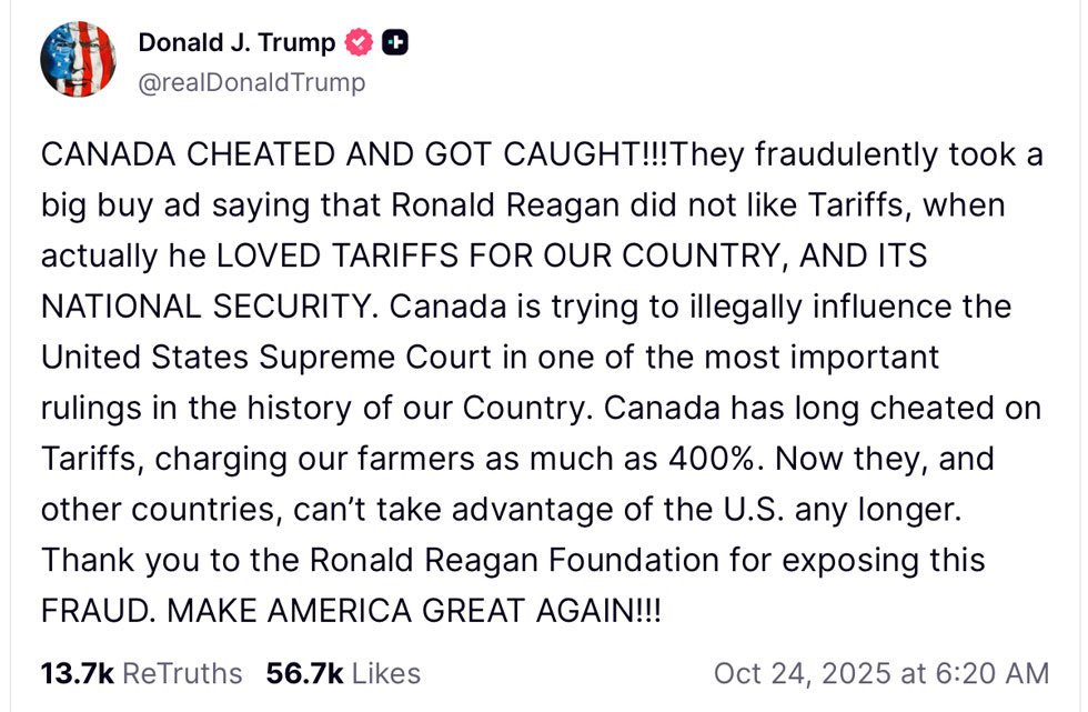 “CANADA CHEATED AND GOT CAUGHT!!!” Trump posted Friday morning. “They fraudulently took a big buy ad saying that Ronald Reagan did not like Tariffs, when actually he LOVED TARIFFS FOR OUR COUNTRY, AND ITS NATIONAL SECURITY.”