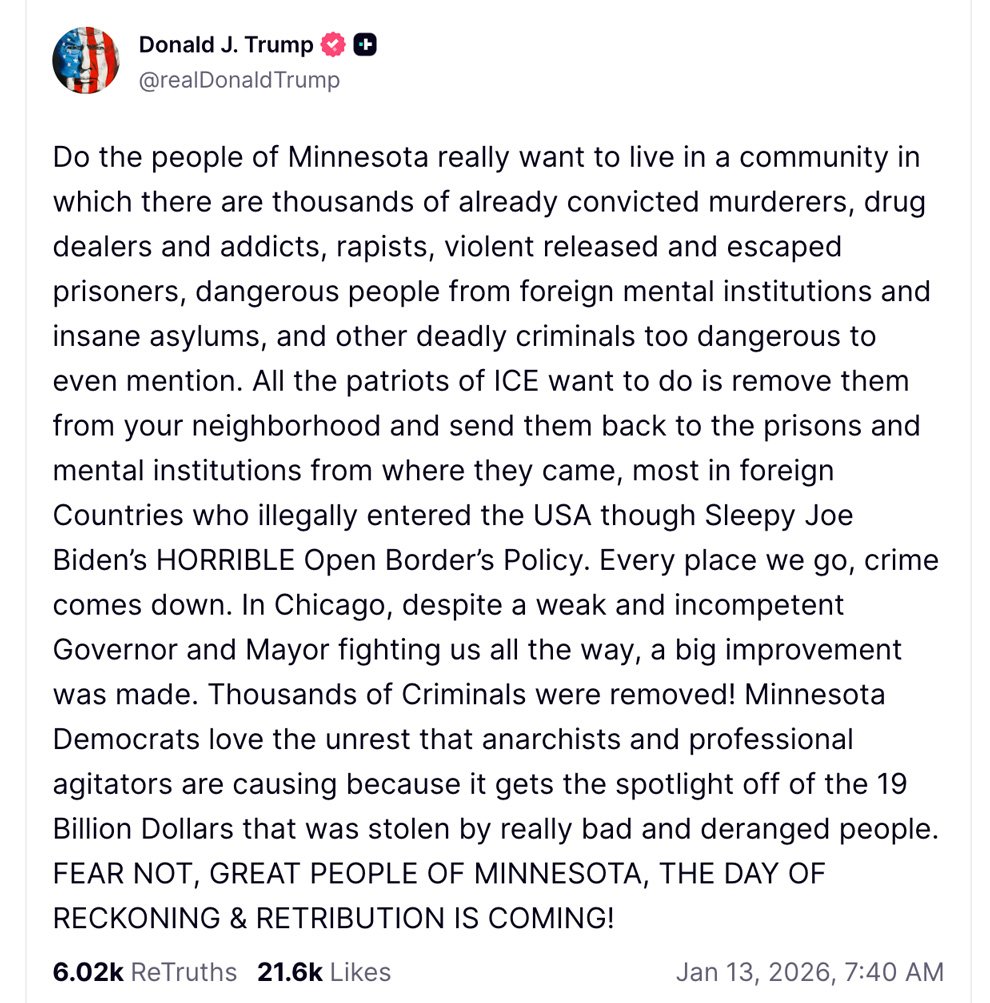 That bombastic language — complete with all‑caps threats of “FEAR NOT, GREAT PEOPLE OF MINNESOTA, THE DAY OF RECKONING & RETRIBUTION IS COMING!” — wasn’t just political theater. It followed a brutal escalation of federal immigration enforcement in the state that’s already triggered lawsuits and fierce resistance.