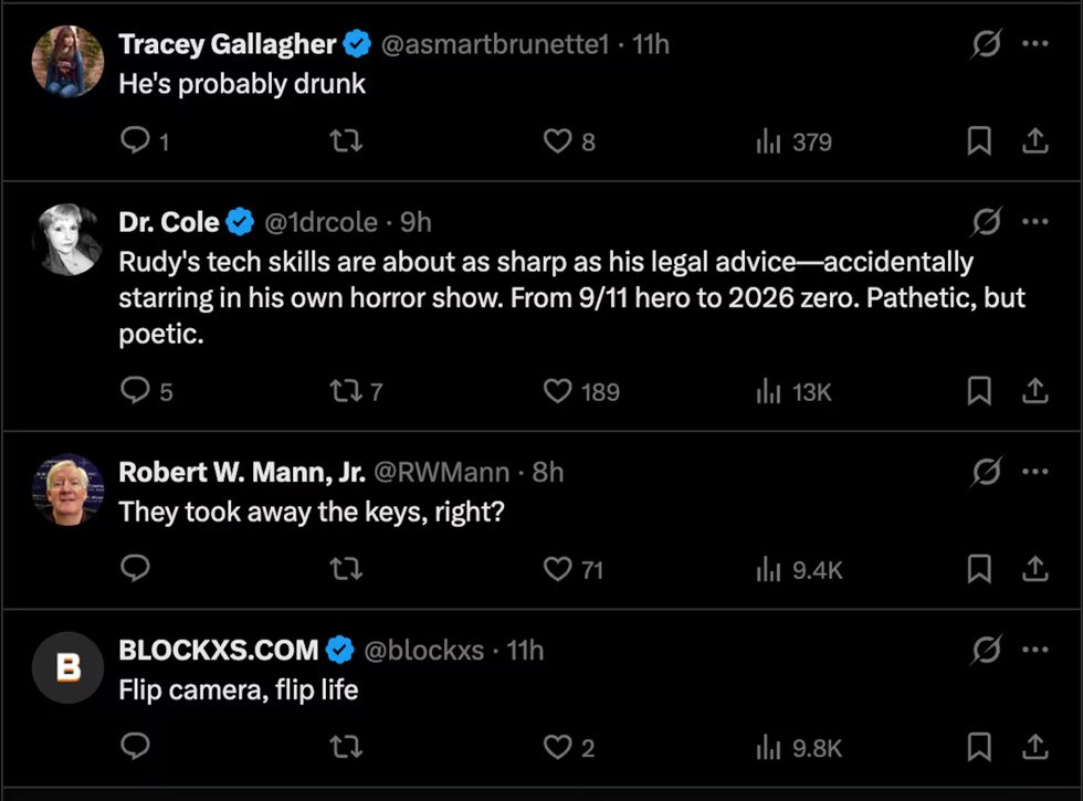 Unsurprisingly, the internet went wild. One user wondered if Giuliani was “drunk,” while another nailed it: “Rudy’s tech skills are about as reliable as his legal advice—now accidentally starring in his own horror show. From 9/11 hero to 2026 zero. Pathetic, but poetic.”