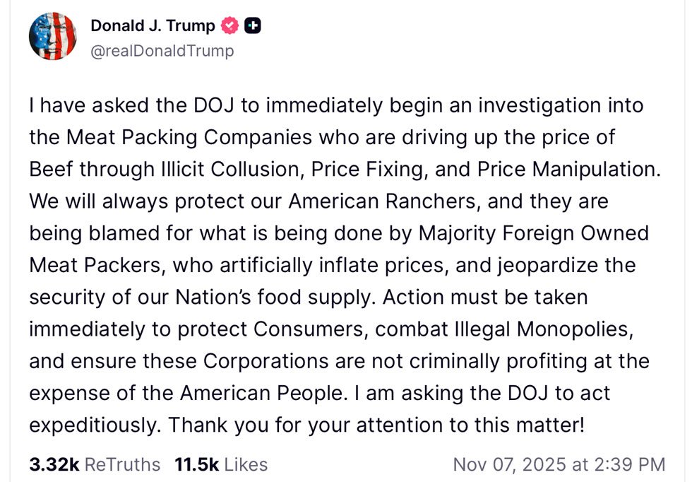 On Truth Social, the president wrote that he had asked the Justice Department to “immediately begin an investigation into the Meat Packing Companies” who he claims “are driving up the price of Beef through Illicit Collusion, Price Fixing, and Price Manipulation.”