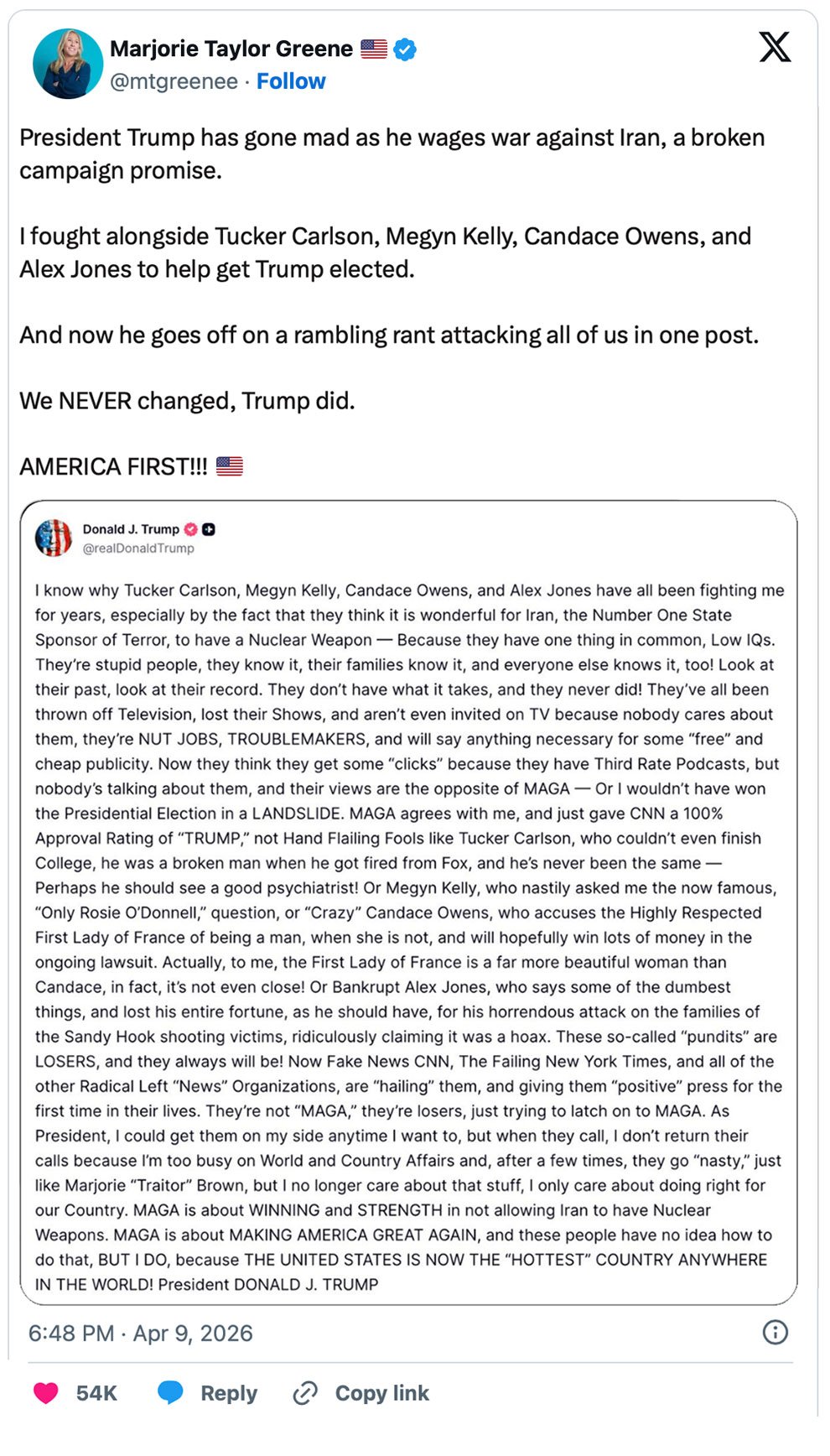 “Trump has gone mad,” Greene wrote, adding that she and others had stood by him politically — only to now find themselves targeted in what she described as a “rambling rant.”