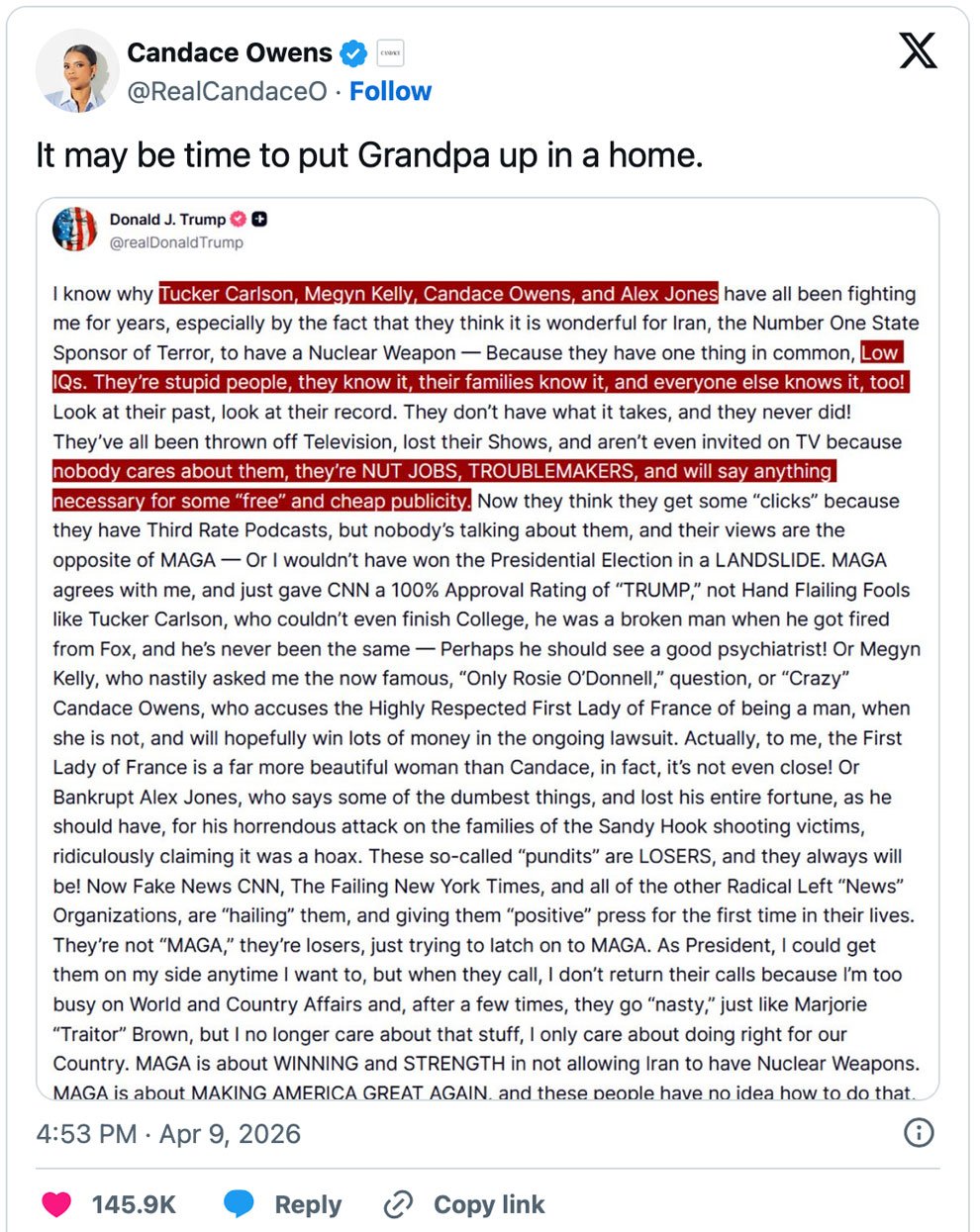 “I know why Tucker Carlson, Megyn Kelly, Candace Owens, and Alex Jones have all been fighting me for years, especially by the fact that they think it is wonderful for Iran, the Number One State Sponsor of Terror, to have a Nuclear Weapon — Because they have one thing in common, Low IQs,” Trump ranted.