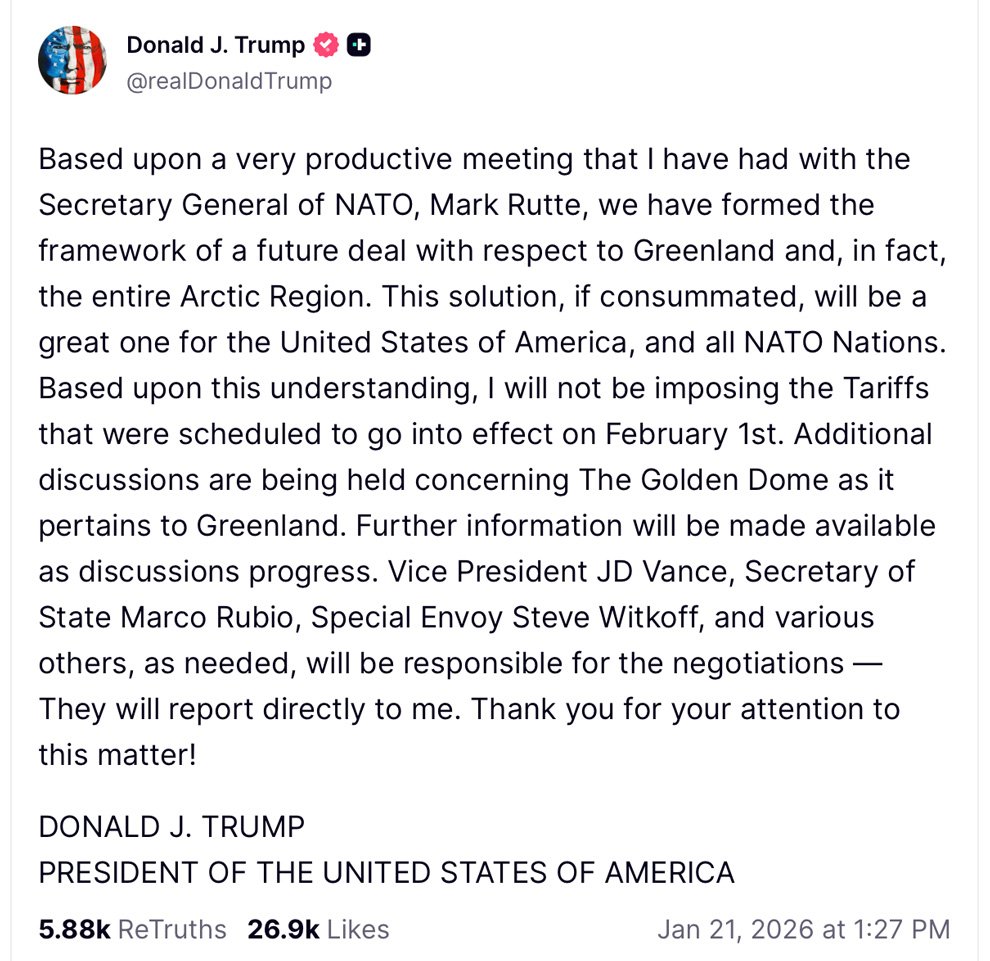 In a post on Truth Social, Trump said a “very productive meeting” with Rutte produced a broad agreement that would satisfy his long-running demands over Greenland and the wider Arctic region. As a result, he said, the tariffs he had promised to impose on February 1 would no longer move forward.