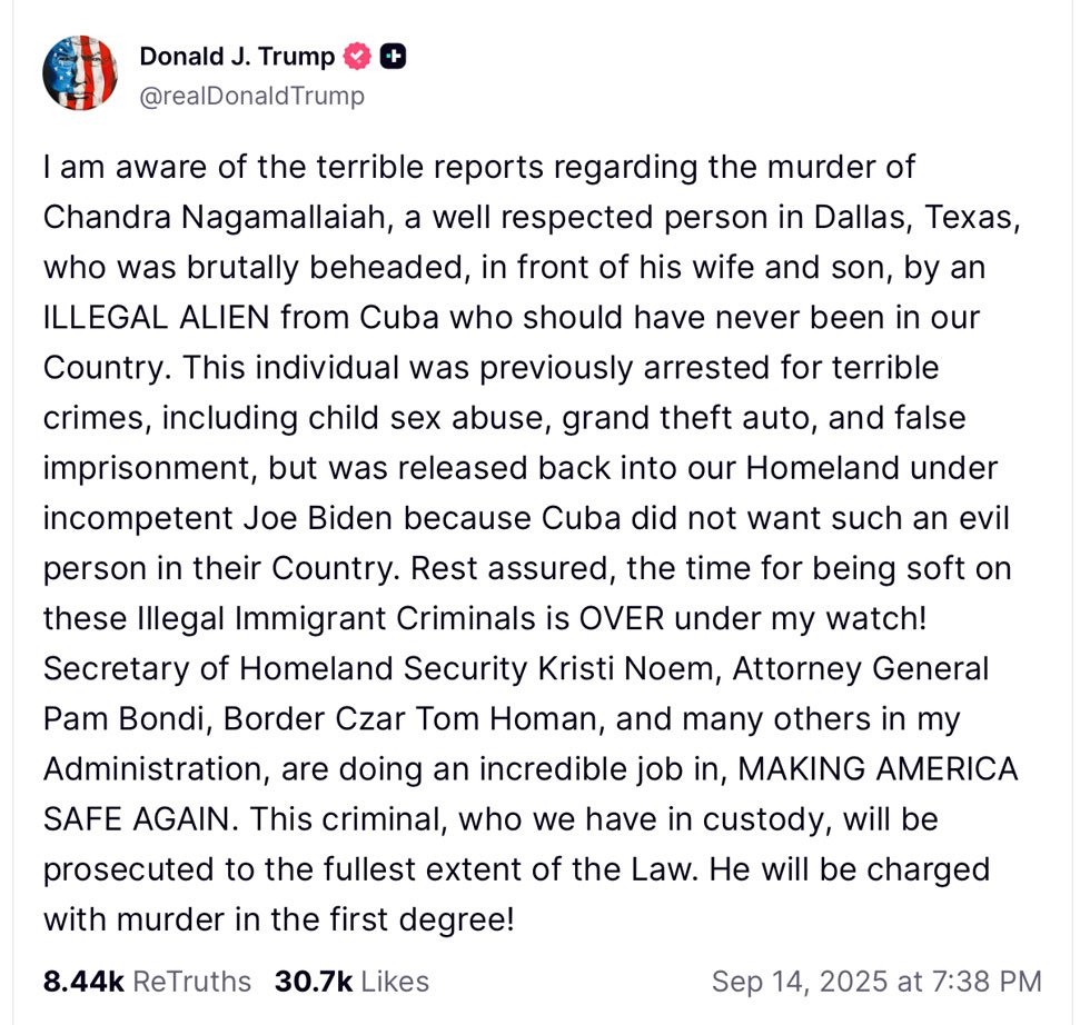“I am aware of the terrible reports regarding the murder of Chandra Nagamallaiah, a well-respected person in Dallas, Texas, who was brutally beheaded, in front of his wife and son, by an ILLEGAL ALIEN from Cuba who should have never been in our Country,” Trump wrote on Truth Social.