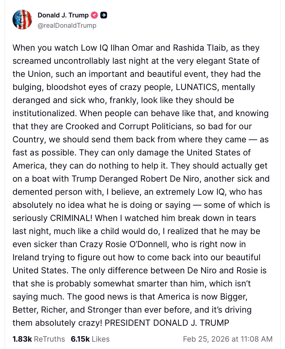 Reps. Ilhan Omar (D-MN) and Rashida Tlaib (D-MI) shouted at Trump during the speech and left before it concluded, prompting a frantic response from the 79-year-old president. On Truth Social, Trump called the lawmakers “Low IQ,” “lunatics,” and “mentally deranged,” adding that they looked like they “should be institutionalized.”
