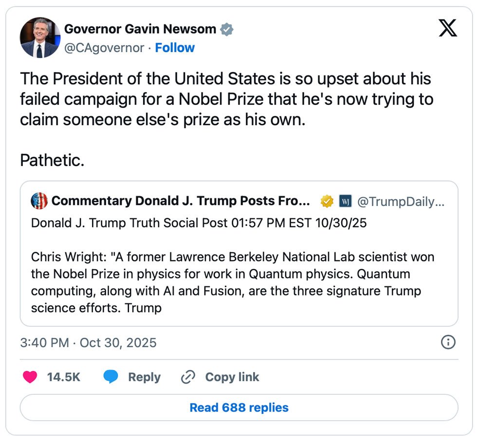 “The President of the United States is so upset about his failed campaign for a Nobel Prize that he’s now trying to claim someone else’s prize as his own,” California Governor Gavin Newsom wrote, before adding: “Pathetic.”