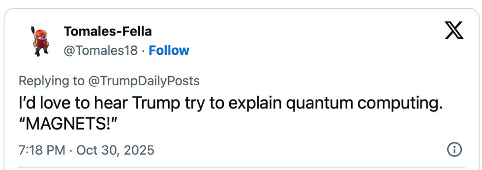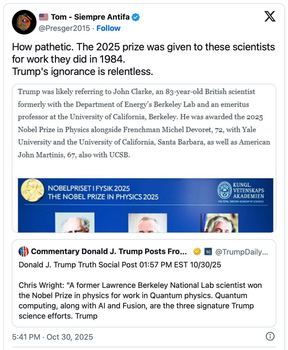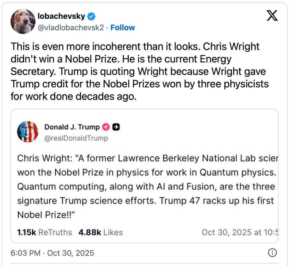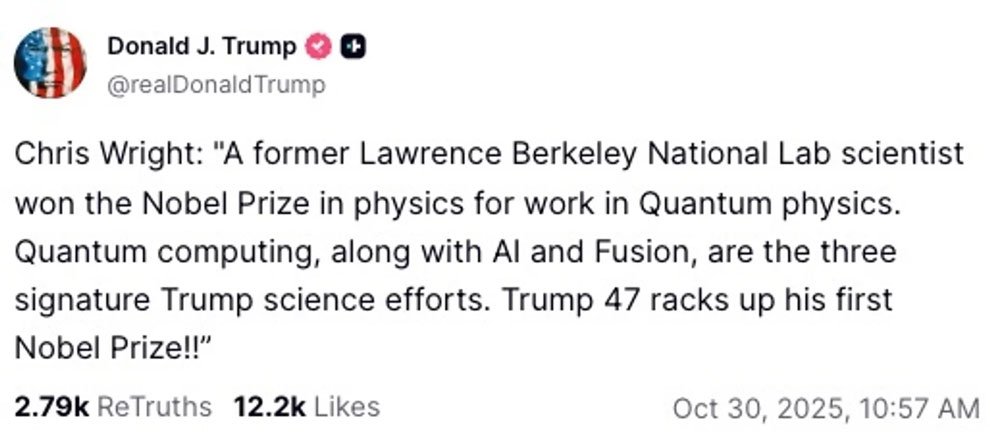 “Quantum computing, along with AI and Fusion, are the three signature Trump science efforts,” the quote reads. “Trump 47 racks up his first Nobel Prize!!”
