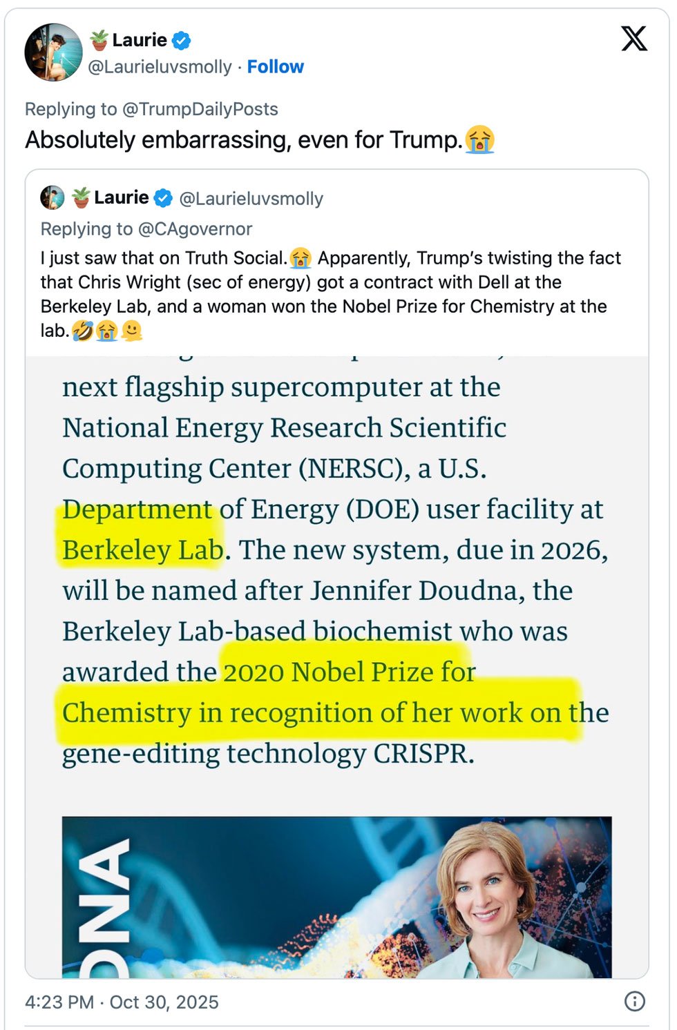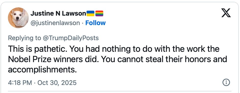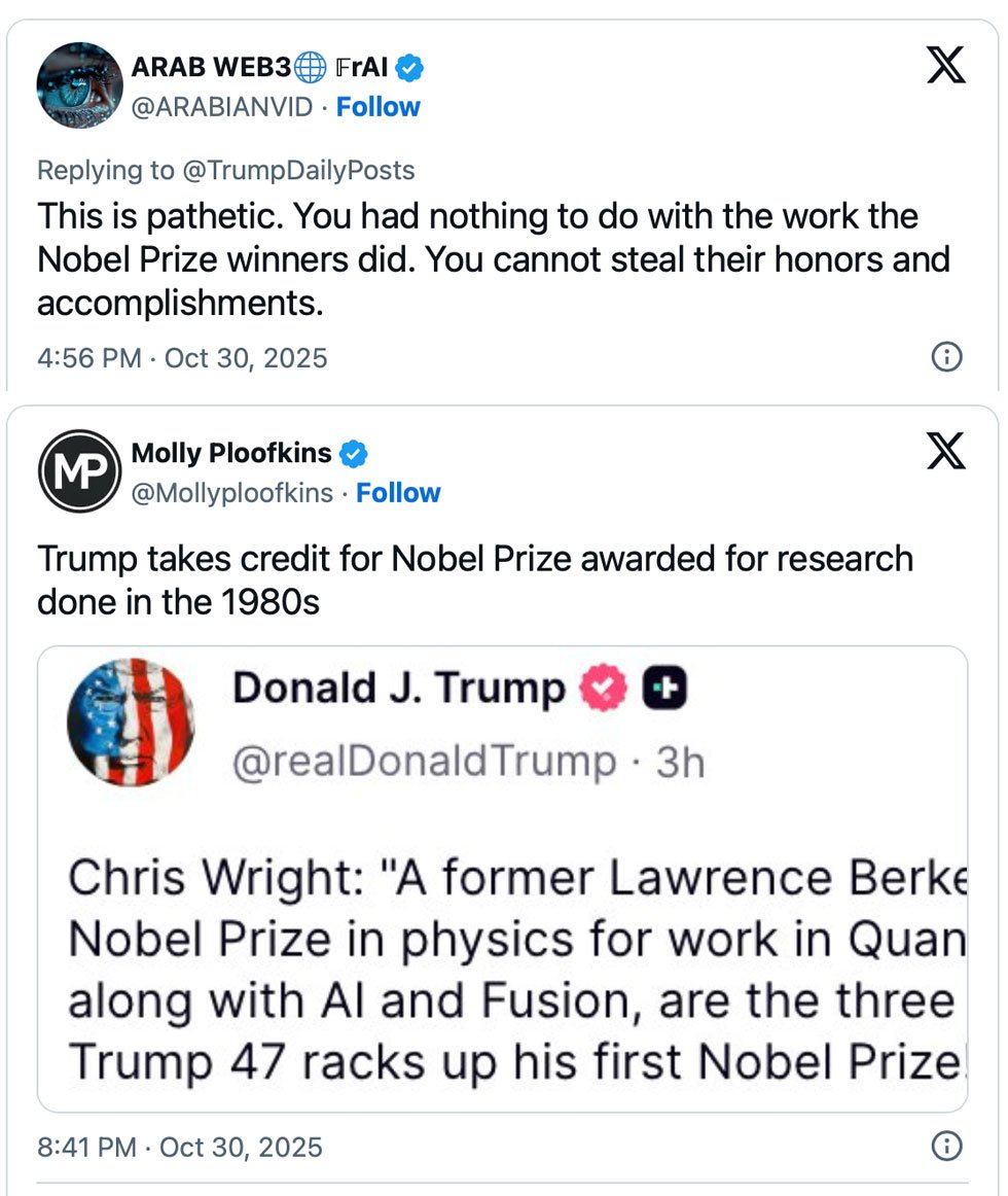 User @obachevsky added: “This is even more incoherent than it looks. Chris Wright didn’t win a Nobel Prize. He is the current Energy Secretary. Trump is quoting Wright because Wright gave Trump credit for the Nobel Prizes won by three physicists for work done decades ago.”