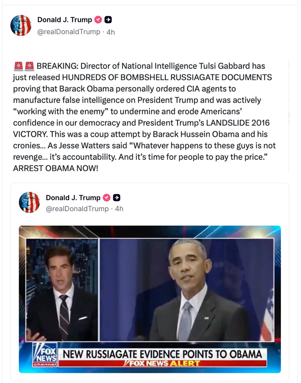 “Barack Hussein Obama is the ringleader,” Trump declared in the clip, lumping Obama together with Joe Biden, Hillary Clinton, and former FBI Director James Comey. Trump went further, claiming Obama had been caught “absolutely cold” trying to “rig” elections.