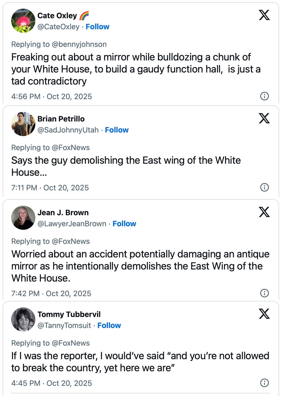 Adding to the irony — or perhaps the perfect symbolism — the incident happened on the same day demolition crews began tearing down part of the East Wing to make room for Trump’s planned $250 million White House ballroom.