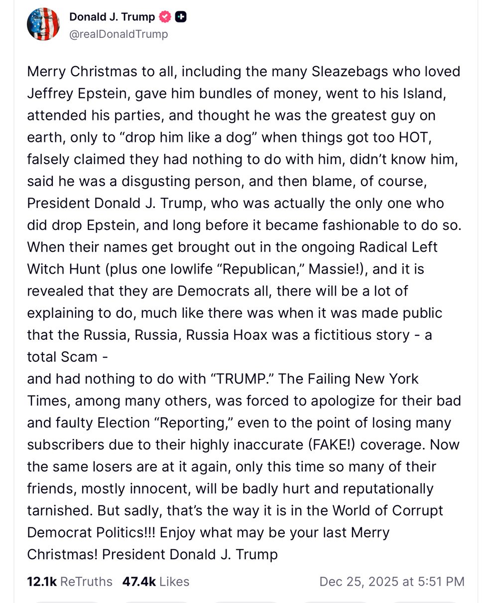 “Merry Christmas to all, including the many Sleazebags who loved Jeffrey Epstein, gave him bundles of money, went to his Island, attended his parties, and thought he was the greatest guy on earth, only to “drop him like a dog” when things got too HOT, falsely claimed they had nothing to do with him, didn’t know him, said he was a disgusting person, and then blame, of course, President Donald J. Trump, who was actually the only one who did drop Epstein, and long before it became fashionable to do so,” Trump wrote on Truth Social.