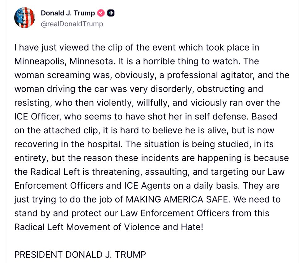 “The woman driving the car was very disorderly, obstructing and resisting, who then violently, willfully, and viciously ran over the ICE Officer, who seems to have shot her in self defense,” Trump wrote. “Based on the attached clip, it is hard to believe he is alive, but is now recovering in the hospital.”