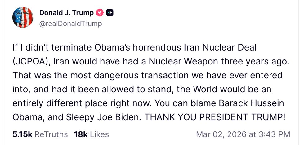 As U.S. strikes on Iran escalate into what’s expected to be a prolonged military operation — one launched without congressional approval — Trump jumped online Monday to pin the entire mess on the 2015 Iran nuclear deal negotiated under former President Barack Obama.