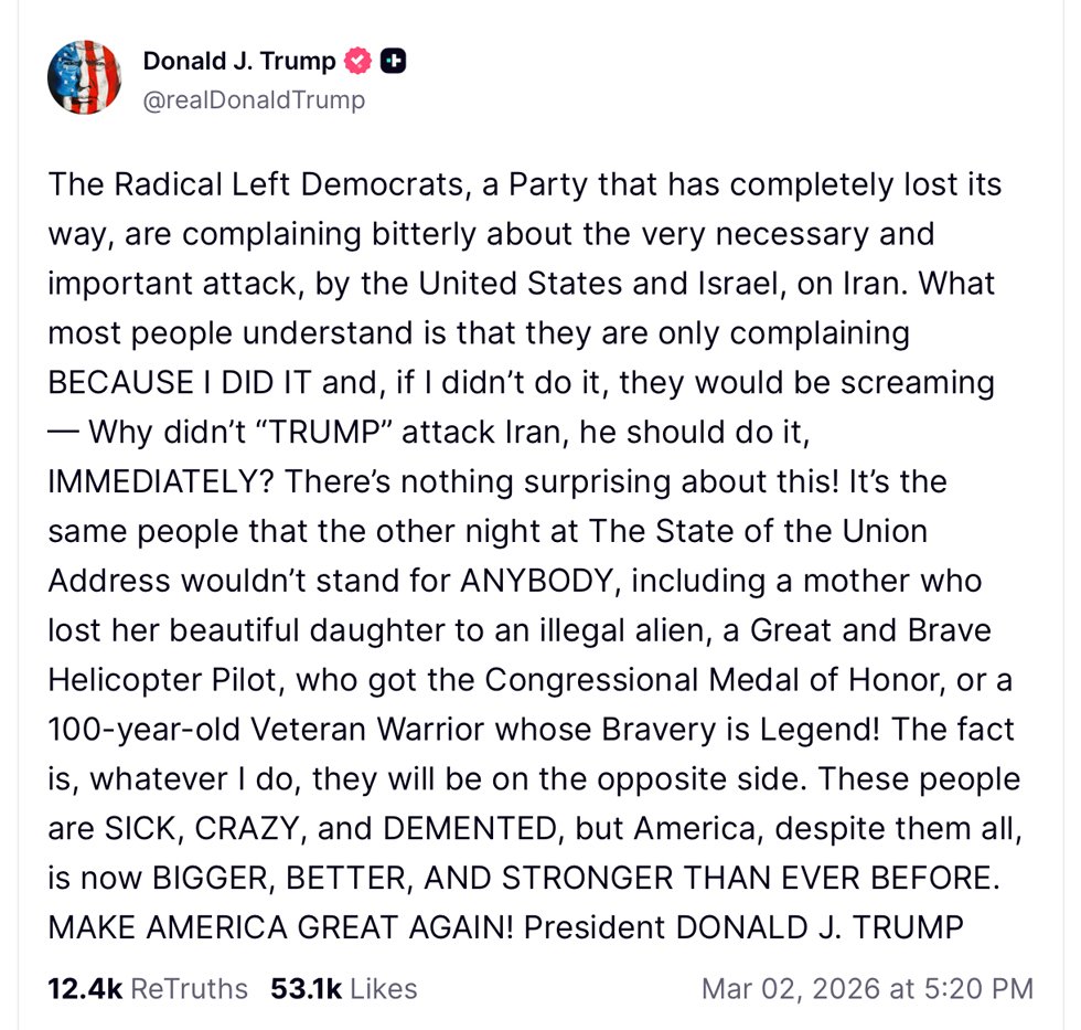 “The Radical Left Democrats, a Party that has completely lost its way, are complaining bitterly about the very necessary and important attack, by the United States and Israel, on Iran,” he wrote. “What most people understand is that they are only complaining BECAUSE I DID IT and, if I didn’t do it, they would be screaming — Why didn’t ‘TRUMP’ attack Iran, he should do it, IMMEDIATELY? There’s nothing surprising about this!”