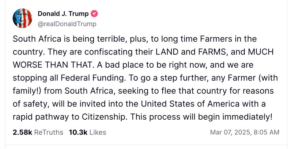 In a post on Truth Social Friday, Trump wrote, “South Africa is being terrible, plus, to long time Farmers in the country. They are confiscating their LAND and FARMS, and MUCH WORSE THAN THAT. A bad place to be right now, and we are stopping all Federal Funding. To go a step further, any Farmer (with family!) from South Africa, seeking to flee that country for reasons of safety, will be invited into the United States of America with a rapid pathway to Citizenship. This process will begin immediately!”