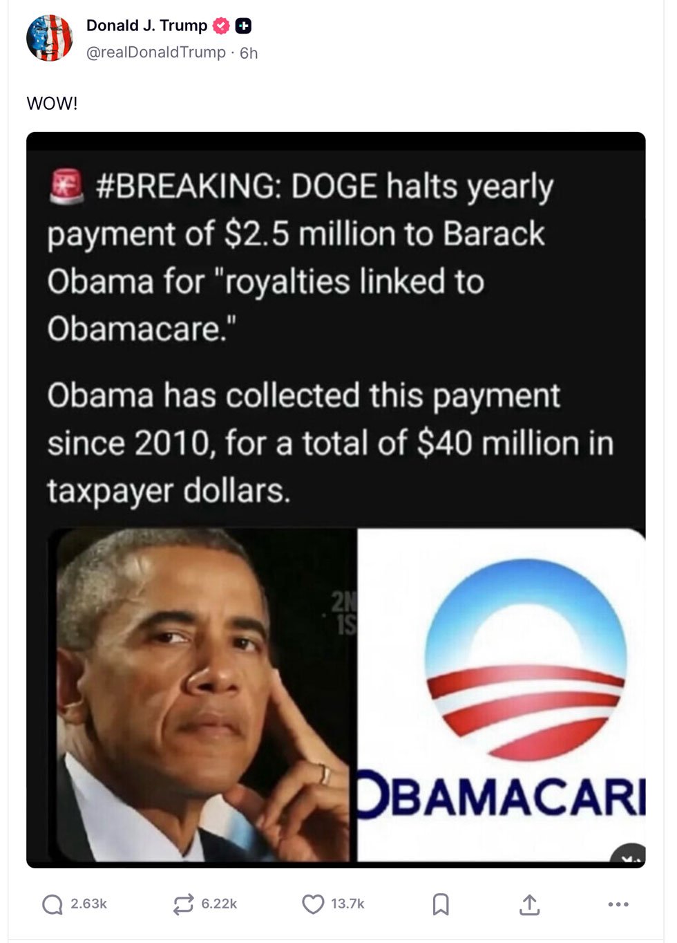 The post Trump shared alleges that Obama has been receiving government payouts labeled as “Obamacare royalties,” and that Trump’s own “Department of Government Efficiency,” or DOGE, recently put a stop to them.