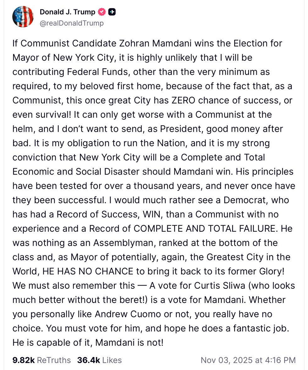“If Communist Candidate Zohran Mamdani wins the Election for Mayor of New York City, it is highly unlikely that I will be contributing Federal Funds, other than the very minimum as required, to my beloved first home, because of the fact that, as a Communist, this once great City has ZERO chance of success, or even survival!” Trump wrote.