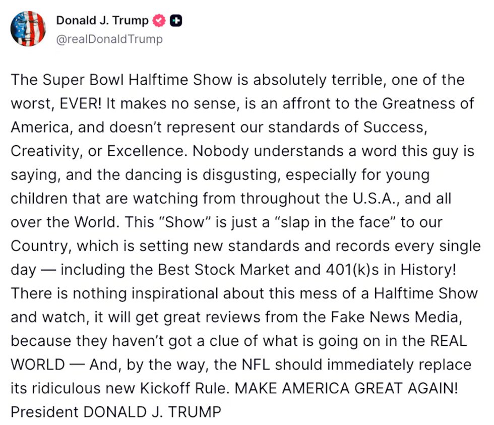 “There is nothing inspirational about this mess of a Halftime Show,” Trump added, predicting — without irony — that it would receive praise from the “Fake News Media, because they haven’t got a clue of what is going on in the REAL WORLD.”