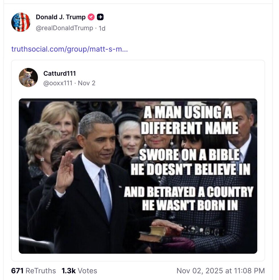 Trump slammed the “re-Truth” button on an image of Obama taking the oath of office, alongside the caption: “A man using a different name. Swore on a Bible he doesn’t believe in. And betrayed a country he wasn’t born in.”