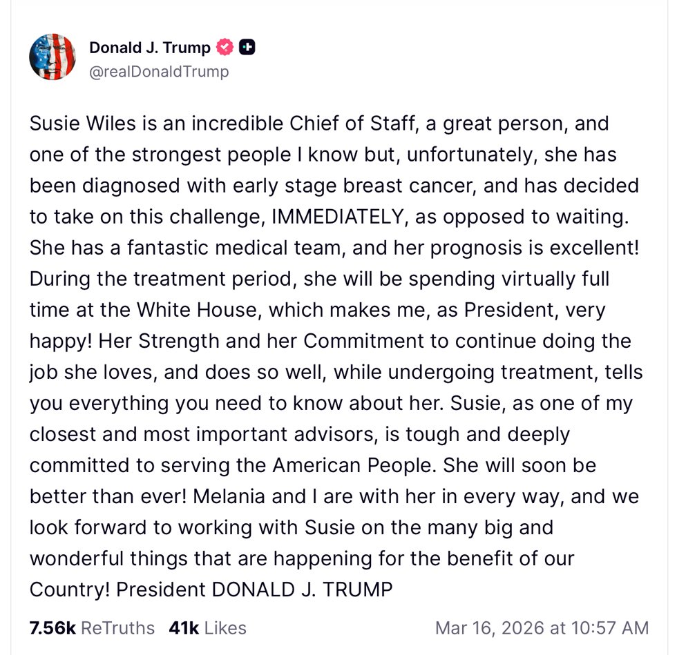 “Susie Wiles has been diagnosed with early stage breast cancer and has decided to take on this challenge, IMMEDIATELY, as opposed to waiting,” Trump wrote.