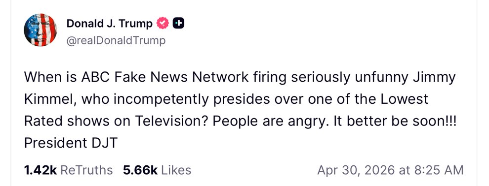 “When is ABC Fake News Network firing seriously unfunny Jimmy Kimmel, who incompetently presides over one of the Lowest Rated shows on Television?” Trump wrote. “People are angry. It better be soon!!! President DJT.”