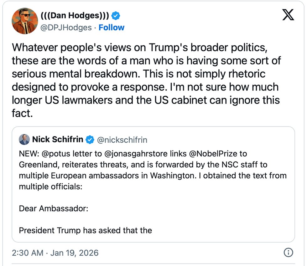 “Whatever people’s views on Trump’s broader politics, these are the words of a man who is having some sort of serious mental breakdown,” wrote British columnist Dan Hodges. “This is not simply rhetoric designed to provoke a response. I’m not sure how much longer US lawmakers and the US cabinet can ignore this fact.”