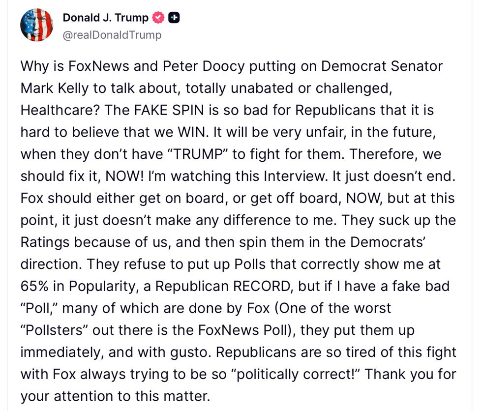 “Why is FoxNews and Peter Doocy putting on Democrat Senator Mark Kelly to talk about, totally unabated or challenged, Healthcare?” Trump wrote in a blistering Truth Social post just moments after the interview aired. “The FAKE SPIN is so bad for Republicans that it is hard to believe that we WIN. It will be very unfair, in the future, when they don’t have ‘TRUMP’ to fight for them.”