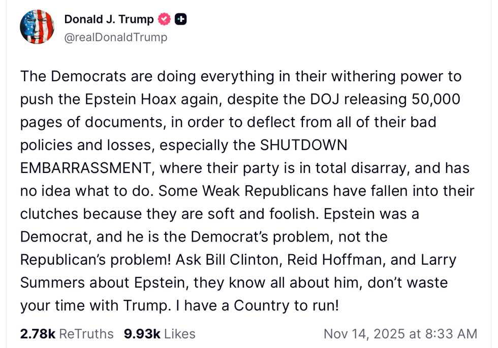 “The Democrats are doing everything in their withering power to push the Epstein Hoax again, despite the DOJ releasing 50,000 pages of documents, in order to deflect from all of their bad policies and losses, especially the SHUTDOWN EMBARRASSMENT, where their party is in total disarray, and has no idea what to do,” Trump wrote on Truth Social.